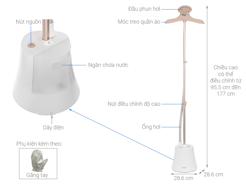 – Bàn ủi Panasonic có màu trắng trang nhã, thiết kế dạng đứng thuận tiện, giúp người dùng ủi quần áo treo nhẹ nhàng mà không cần khom lưng. Trụ đứng có thể tùy chỉnh chiều cao từ 95.5 cm đến 177 cm để bạn dễ dàng treo và ủi nhiều loại quần áo khác nhau. Khối lượng tay cầm tương đối nhẹ giúp bạn không cảm thấy mỏi tay ngay cả khi sử dụng trong thời gian dài.
