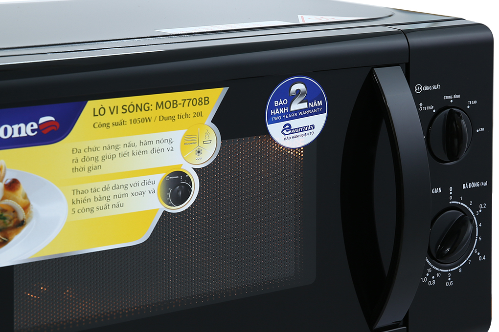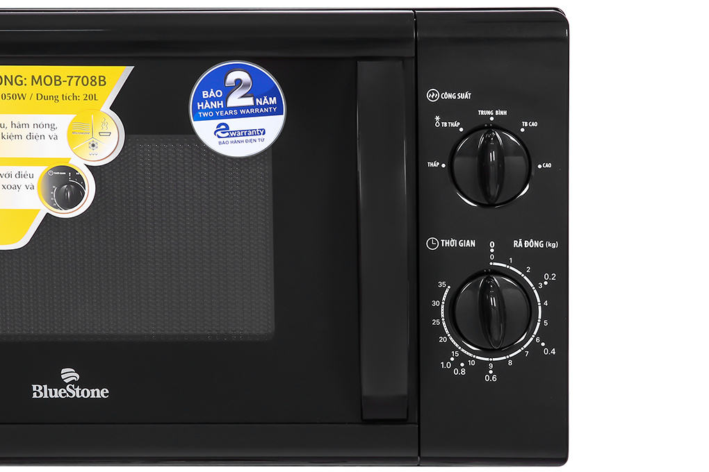 Lò vi sóng BlueStone MOB-7708B 20 lít của thương hiệu BlueStone – Singapore uy tín, công suất 1050W với 5 mức điều chỉnh làm chín thức ăn nhanh, điều khiển nút vặn tiếng Việt dễ hiểu, đa chức năng, kiểu dáng nhỏ gọn, phù hợp với gia đình ít thành viên.