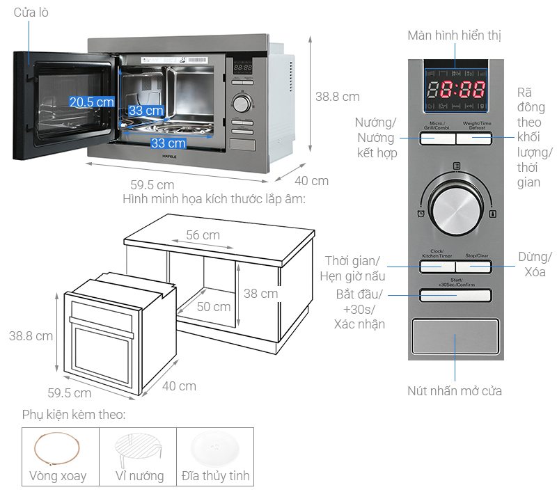 Lò vi sóng Hafele thiết kế lắp âm tủ tiết kiệm không gian. Thiết kế tối giản nhưng vẫn sang trọng với sự kết hợp màu xám bạc và đen mạnh mẽ.