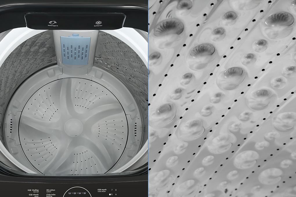 Lồng giặt được làm từthép không gỉ, bền chắc và hạn chế bám cặn. Nhờ thiết kế rộng rãi, nước và bột giặt dễ dàng len lỏi giữa từng lớp vải, giúp quần áo sạch sâu mà không bị xoắn rối. Các lỗ thoát nước nhỏ bố trí đều xung quanh giúp tăng hiệu quả giặt sạch nhưng vẫn nhẹ nhàng với sợi vải.