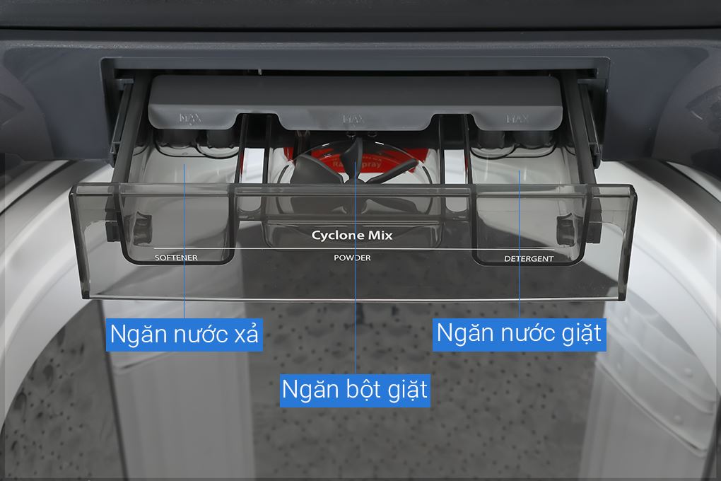 Với CycloneMix, dòng nước mạnh mẽ làm quay cánh quạt nhỏ bên trong ngăn chứa, giúp hòa tan chất giặt tẩy triệt để trước khi đưa vào lồng giặt. Các bọt xà phòng siêu mịn thấm sâu vào sợi vải, hỗ trợ đánh bật vết bẩn cứng đầu và mang lại hiệu quả giặt sạch đồng đều hơn.