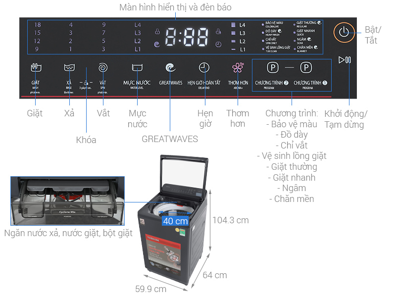 GreatWaves là công nghệ giặt độc quyền của Toshiba, tạo nên hệ thống nhiều luồng nước mạnh mẽ gồm: