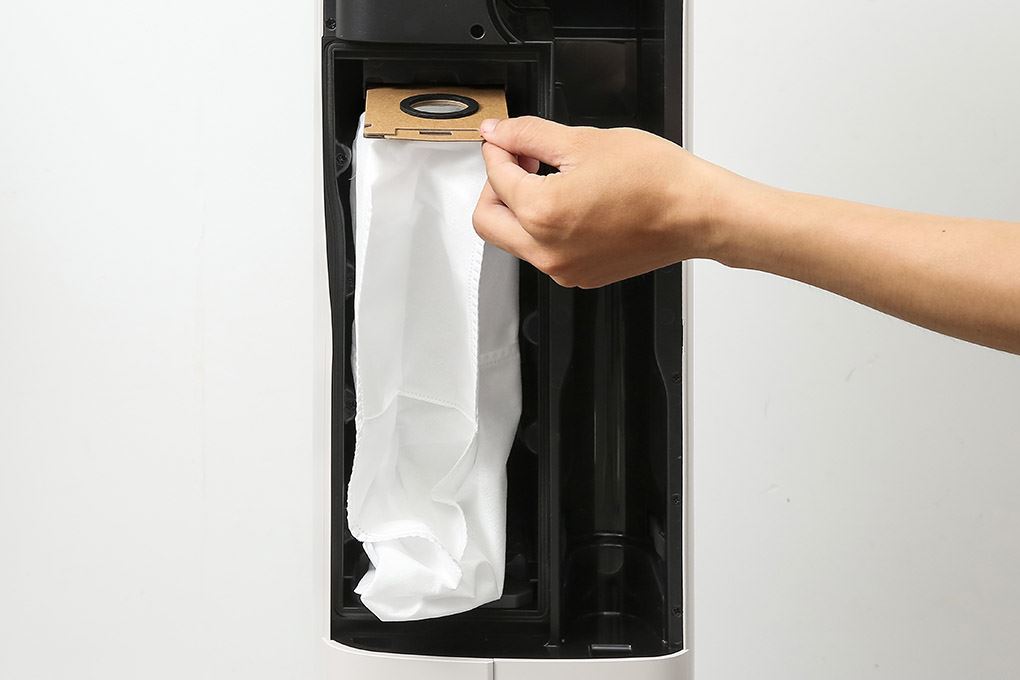 Hub trung tâm tiếp nhận rác từ thân máy và lưu trong túi kín khi máy tự hút – đổ bụi, không khí được lọc trước khi xả ra ngoài, giúp giảm phát tán hạt mịn tại dock và giữ khu vực sạc sạch sẽ.