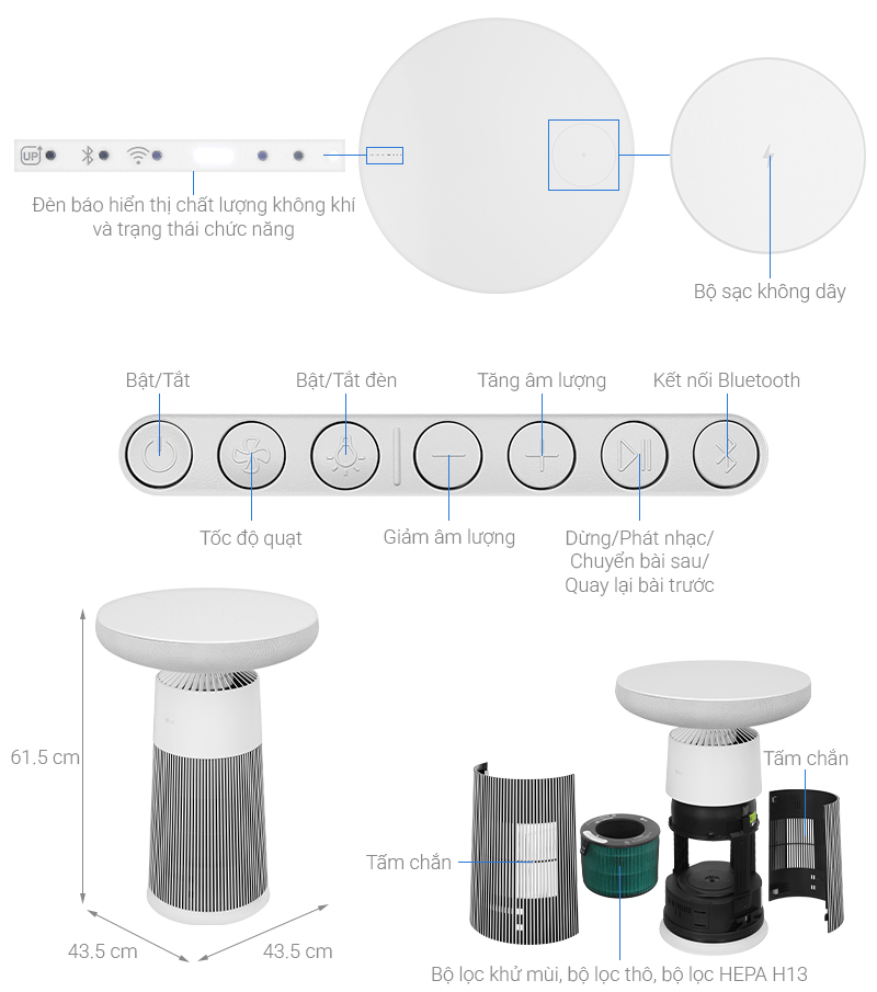 Máy Lọc Không Khí LG PuriCare Aero Speaker AS20GSHU0.ABAE sở hữu thiết kế bàn tròn tinh tế kết hợp cùng gam màu trắng trang nhã. Ngoài chức năng lọc không khí, sản phẩm còn đóng vai trò như một chiếc bàn nhỏ gọn, nơi bạn có thể đặt đèn, sách báo hay điện thoại mà vẫn giữ được không gian sống gọn gàng, thoáng đãng.