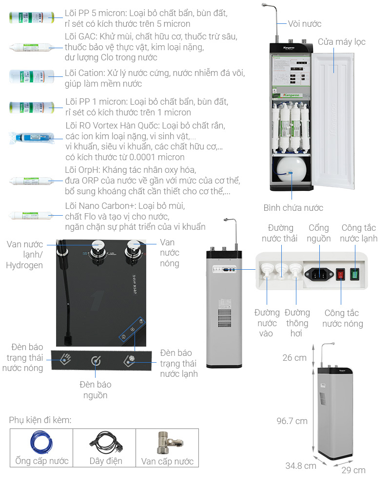 Máy lọc nước RO nóng nguội lạnh Kangaroo Waterfall KG10A10S 7 lõi thiết kế tủ đứng gọn gàng, dễ bố trí, công suất lọc ≥18 lít/giờ với 3 chế độ nước, công nghệ Block cho nước lạnh sâu và nhanh chóng,…
