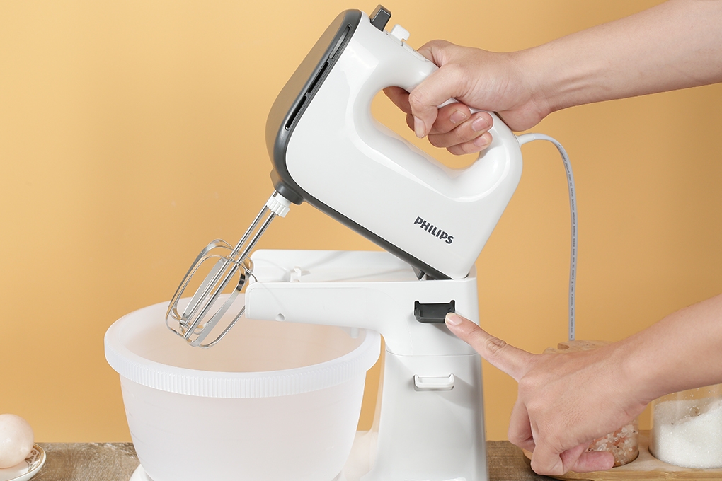 – Máy đánh trứng Philips còn trang bị nút nhấn có kí hiệu mũi tên để tháo que trộn hoặc que đánh trứng ra một cách dễ dàng.
