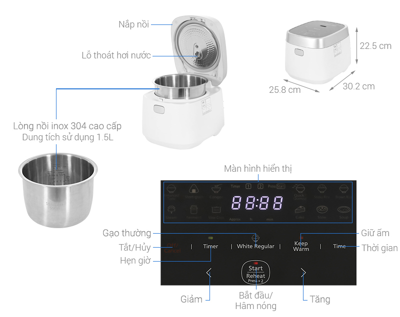 – Giữ ấm tự động sau khi nấu, khuyến nghị dùng trong vòng 12 giờ để giữ được hương vị tốt nhất.