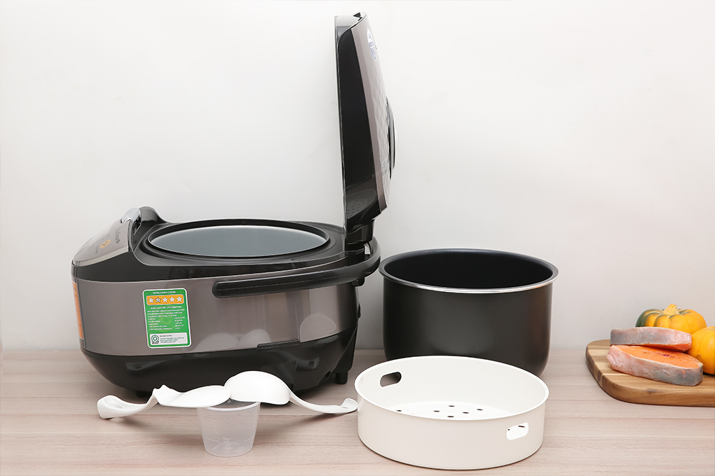 – Phụ kiện đi kèm nồi cơm điện: xửng hấp, cốc đong gạo, muỗng cơm, muỗng canh.
