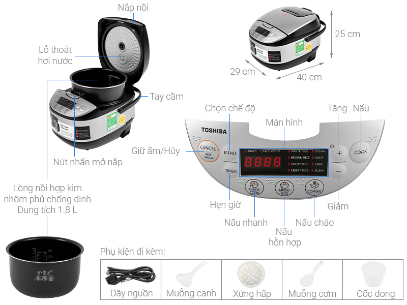 Nồi cơm điện tử Toshiba 1.8 lít RC-18DR2PV(K) đến từ thương hiệu uy tín Nhật Bản, nồi nấu cơm ngon phù hợp cho mọi gia đình.