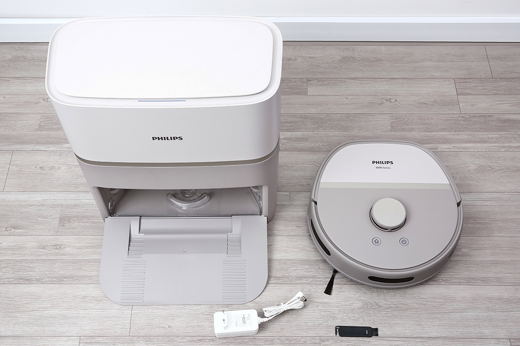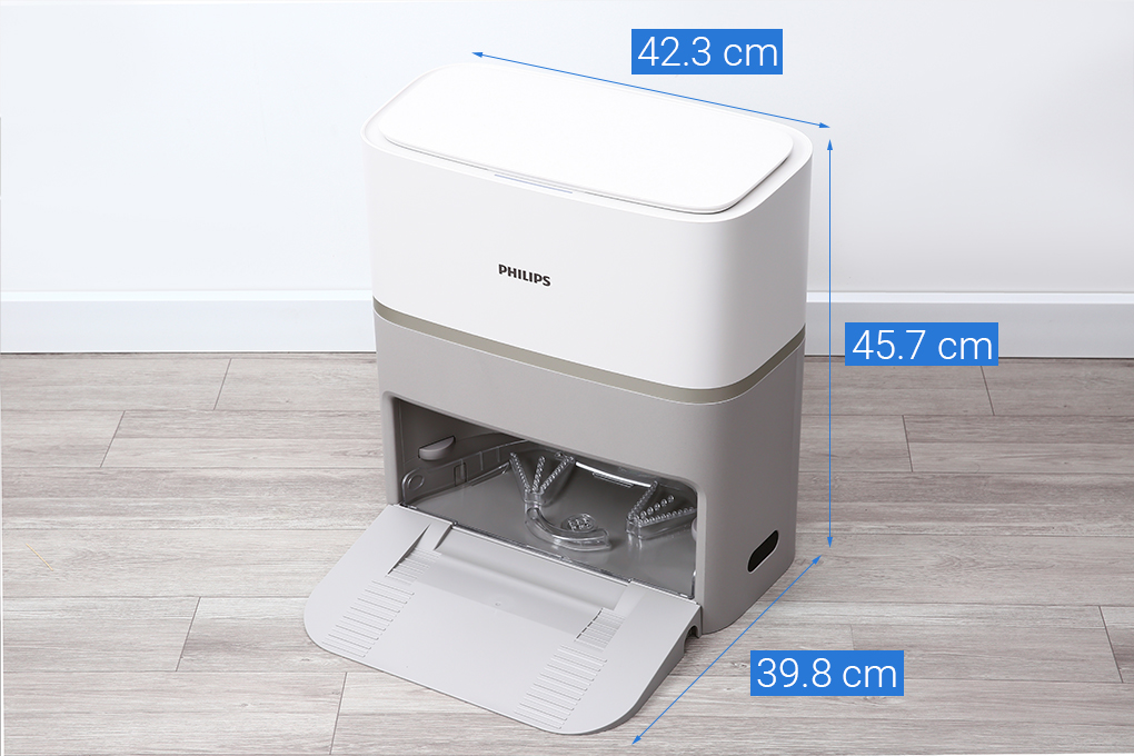 – Trang bị hộp chứa bụi 400 ml khá lớn, hạn chế đổ bụi nhiều lần. Ngoài ra ngay tại trạm sạc có trang bị hộp nước dung tích đến 4.5 lít để hỗ trợ cho quá trình tự động làm sạch giẻ lau tại trạm. Robot sẽ làm ẩm khăn lau tại trạm sạc trước khi bắt đầu chu trình lau nhà.