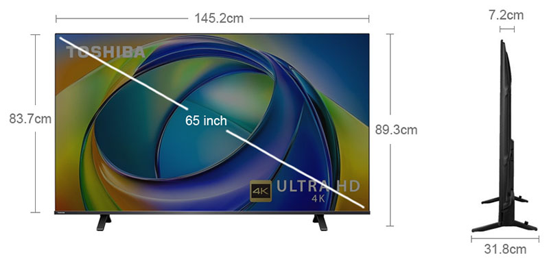 Smart Tivi Toshiba AI 4K 65 inch 65C350RP gây ấn tượng mạnh mẽ ngay từ cái nhìn đầu tiên với thiết kế viền siêu mỏng, tối ưu tỷ lệ hiển thị và mang đến cảm giác sang trọng, hiện đại cho không gian sống. Với kích thước 65 inch, chiếc tivi này đặc biệt phù hợp cho phòng khách rộng, phòng họp hay không gian giải trí gia đình, mang lại trải nghiệm xem đắm chìm như trong rạp phim tại nhà. Phong cách thiết kế tinh gọn, tối giản nhưng đầy tính thẩm mỹ giúp tivi dễ dàng hòa hợp với mọi phong cách nội thất.